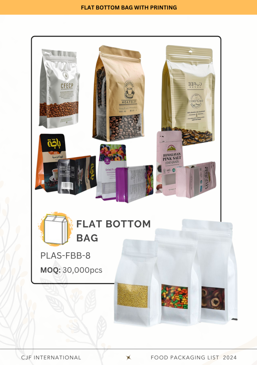 Flat Bottom Bag: Known for stability and efficient use of shelf space, these bags are ideal for a variety of products.