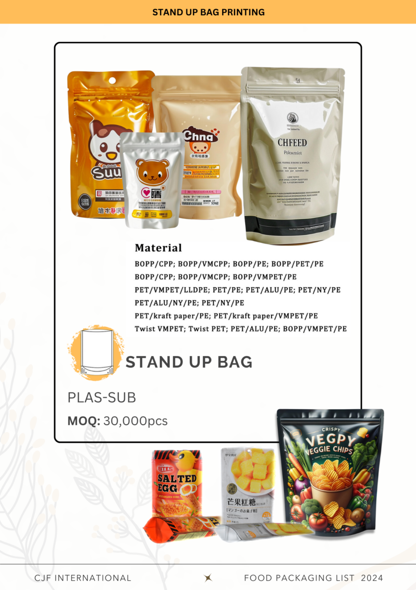 Stand Up Bag: Popular for their ability to stand upright, these bags are excellent for display purposes.